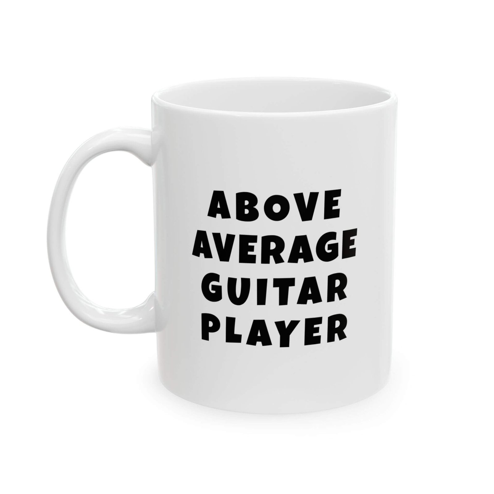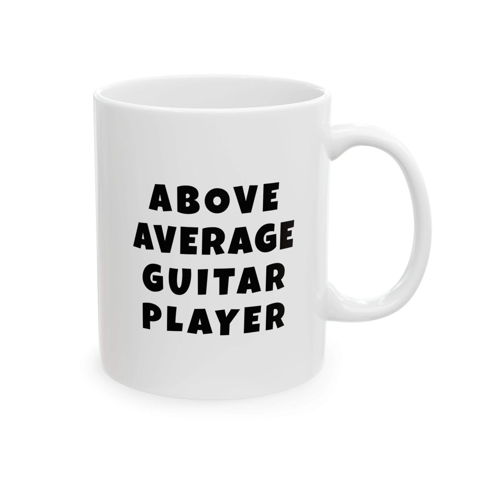 Above average guitar player. A cheerful, bold mug for musicians and music lovers. 11oz ceramic, glossy finish, dishwasher & microwave safe, lead-free & BPA-free. Ships Free – Packed with Love for Musicians – Because Good Timing Matters.