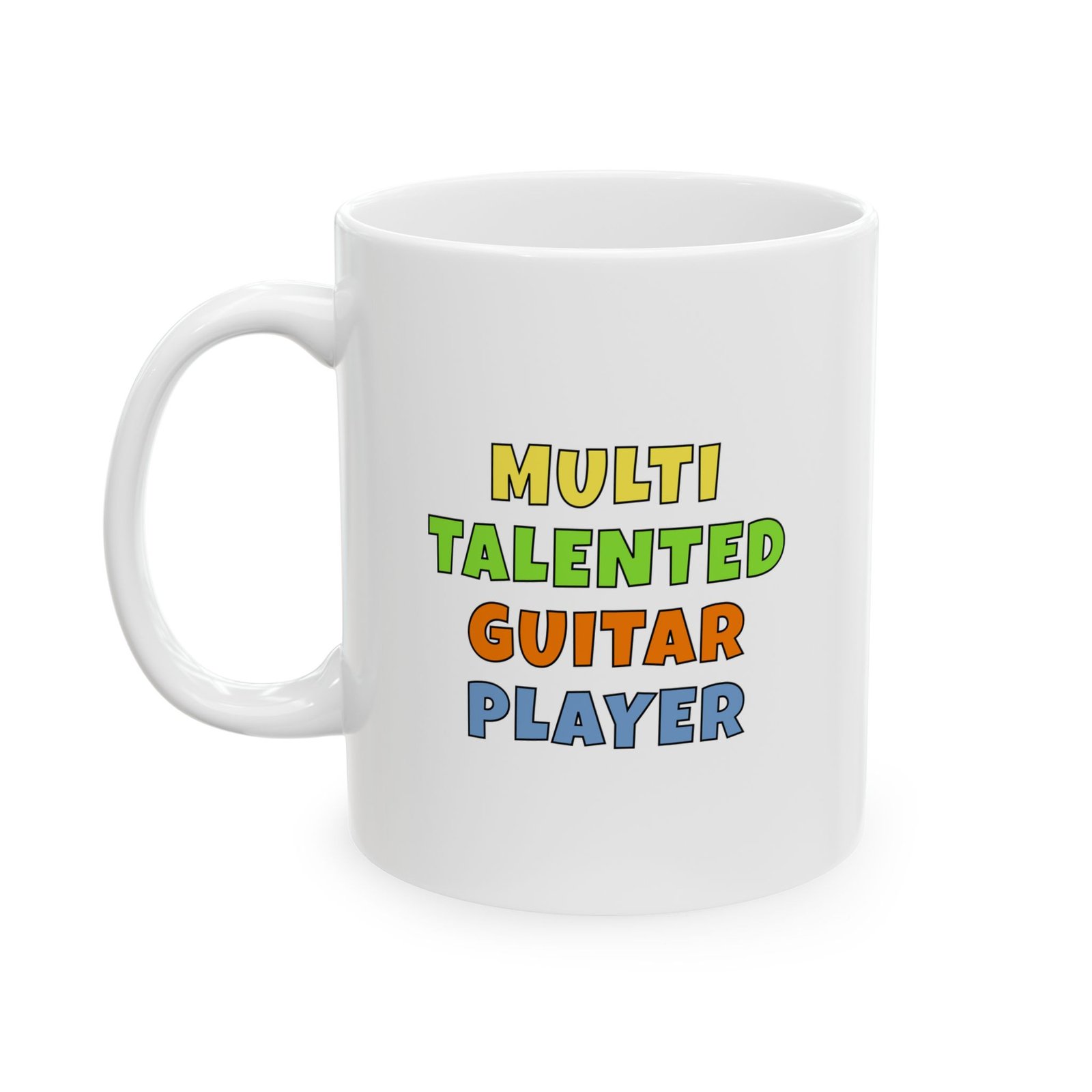 Multi talented guitar player. A cheerful, bold mug for musicians and music lovers. 11oz ceramic, glossy finish, dishwasher & microwave safe, lead-free & BPA-free. Ships Free – Packed with Love for Musicians – Because Good Timing Matters.