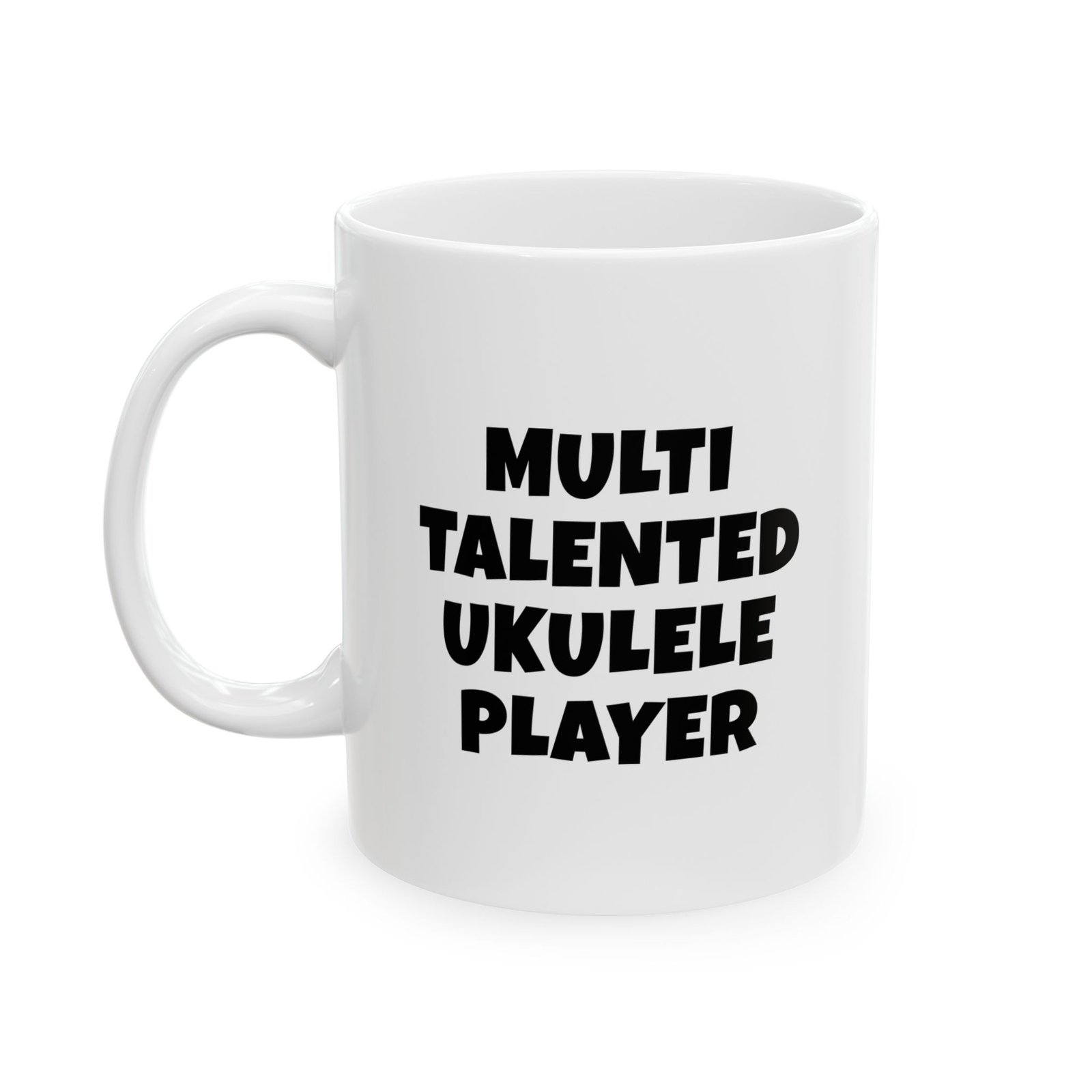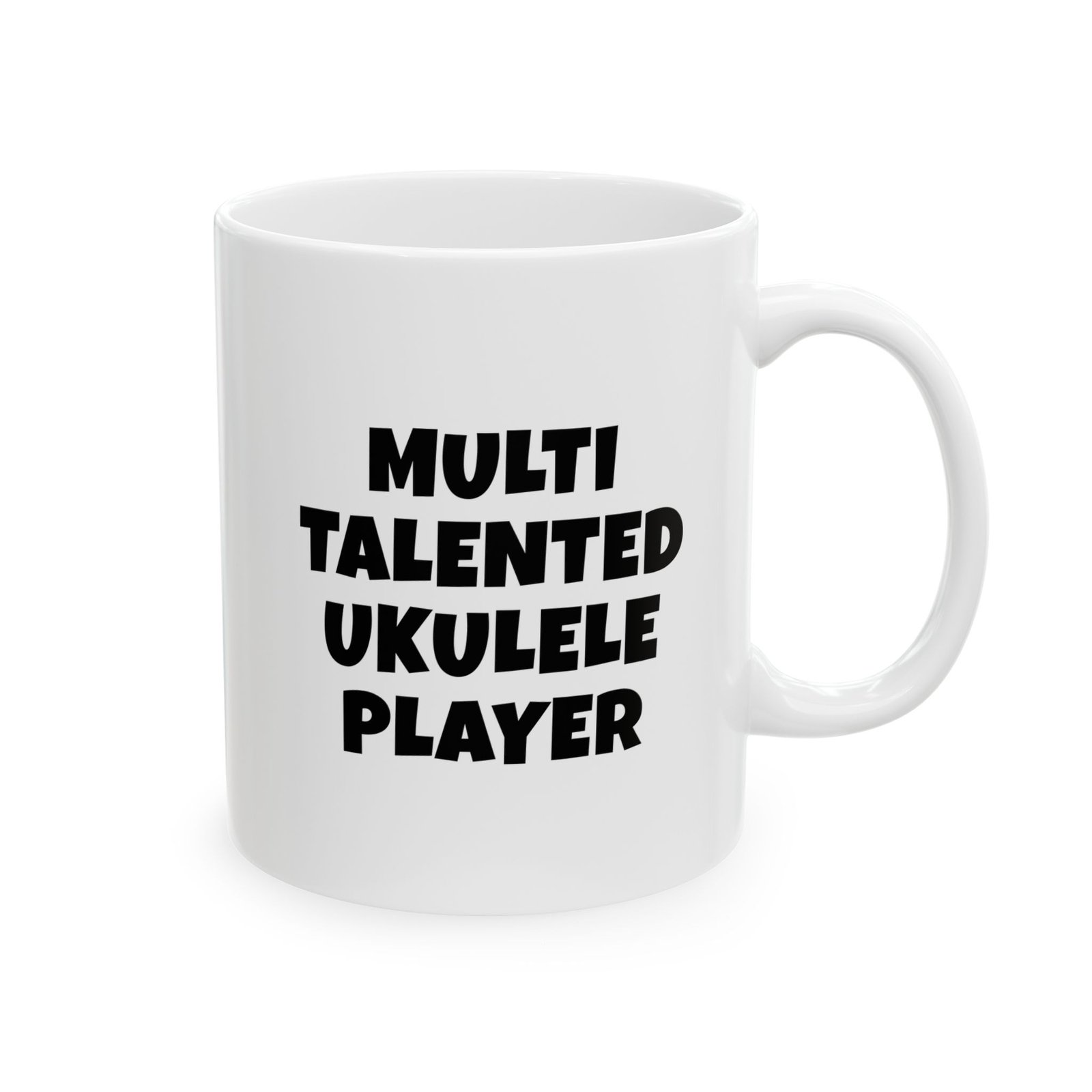 Multi-talented ukulele player. A vibrant mug for musicians who do it all — sing, strum, and smile through every song. 11 oz ceramic, glossy finish, dishwasher & microwave safe, lead-free & BPA-free. Ships Free – Packed with Love for Musicians – Because Good Timing Matters.